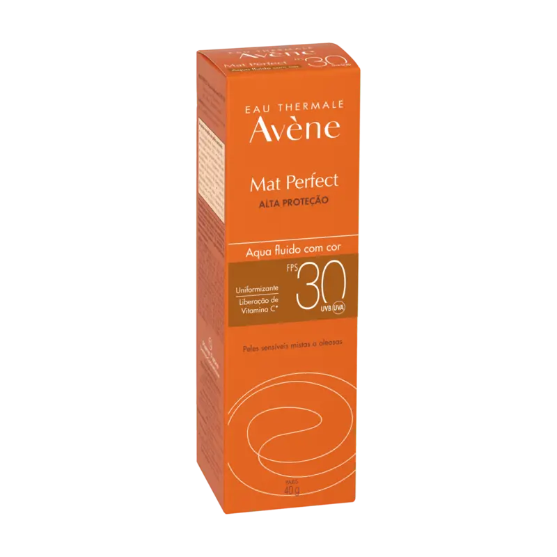 Alta proteção solar uniformizante para peles mistas a oleosas e sensíveis. Graças a seus pigmentos leves e tom universal, este protetor solar diário uniformiza o tom da pele, para uma pele brilhante, radiante e refrescante. O Mat Perfect Aqua Fluido Com Cor FPS 30 aproveita os benefícios do exclusivo complexo de ingredientes ativos de proteção Sunsitive® Protection desenvolvido pelos Laboratórios Pierre Fabre. Este sistema de filtros patenteado oferece proteção UVB-UVA muito ampla e fotoestável. Para maior proteção celular contra os radicais livres, este confortável fluido contém um complexo antioxidante único, com um precursor fotoestável de vitamina E (Pré-tocoferil) e um precursor fotoestável de vitamina C (Ascorbil Glucosídeo). A Água Termal Avène, conhecida por suas propriedades calmantes, anti-irritantes e suavizantes, completa esta fórmula, proporcionando uma sensação refrescante na aplicação. Sua nova textura ultraleve com toque seco, tem um acabamento não gorduroso e efeito mate. Esse fluido matificante com um acabamento não oleoso, não brilhante é formulado de acordo com a abordagem Skin Protect Ocean Respect ecologicamente responsável.
