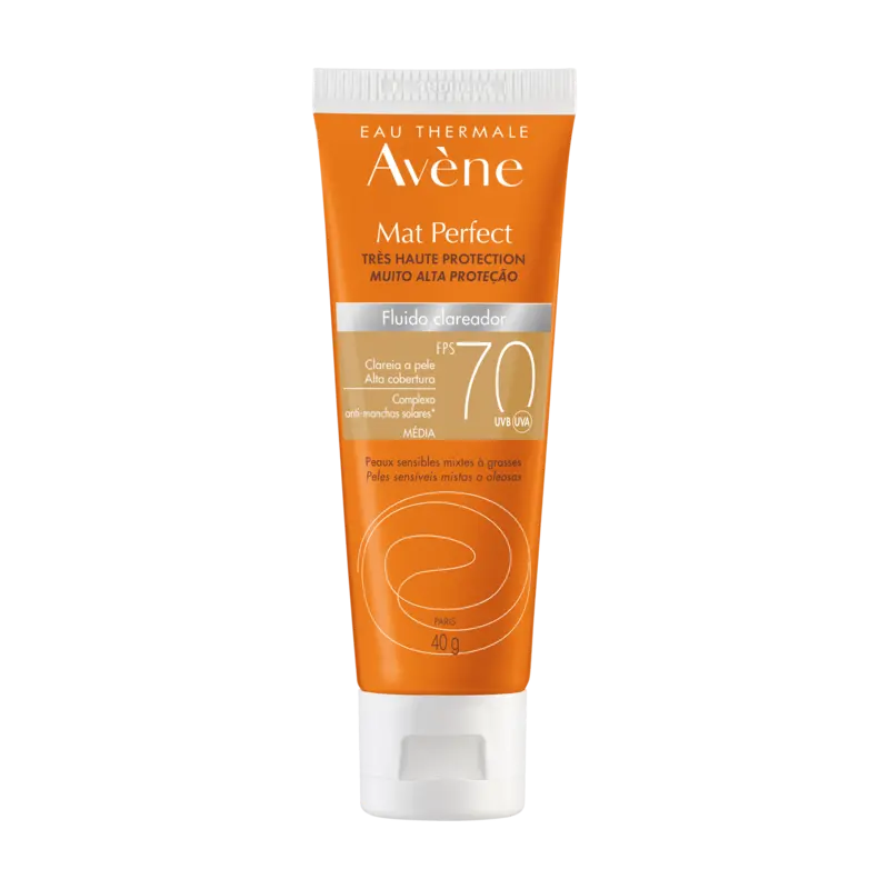 Mat Perfect Fluido clareador FPS 70 é um protetor solar com muito alta proteção contra os raios UVB, UVA e que traz um benefício da ação clareadora que ajuda a clarear, prevenir e uniformizar manchas. Sua fórmula matifica a pele por 12h².